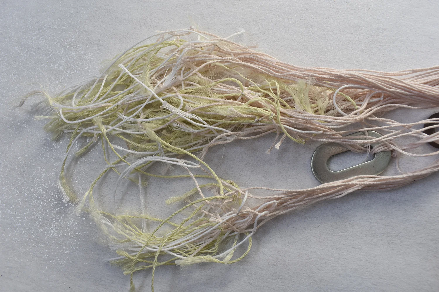 handspun plastic bag, osage orange dyed handspun printed paper from early thesis drafts, and linen weft